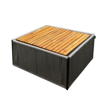 Mesa de centro de diseño moderno con estructura cuadrada tejida, que aporta resistencia y estilo contemporáneo. La cubierta de madera en listones naturales o cubierta tecnológica ofrece un contraste cálido y elegante. Ideal para salas, terrazas o áreas exteriores, combinando funcionalidad y diseño en una sola pieza. Disponible en diferentes materiales y colores.