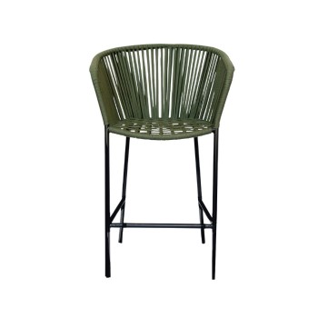 Silla de diseño artesanal y moderno, con estructura de madera y tejido en fibras naturales. Sus cojines en tono beige brindan comodidad y elegancia. Ideal para interiores o terrazas cubiertas. Disponible en diferentes colores.