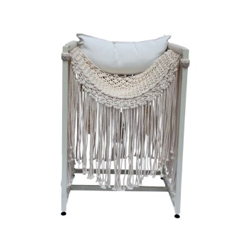 Silla es una pieza bohemia y elegante que combina artesanía y confort. Su estructura metálica brinda firmeza y durabilidad, mientras que el respaldo de macramé tejido a mano añade un toque artístico y natural con sus flecos decorativos. El cojín aporta suavidad y comodidad, convirtiéndola en una opción ideal para espacios interiores o terrazas. Disponible en diferentes colores.