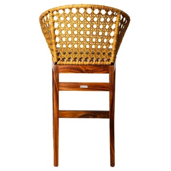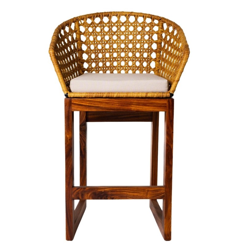 Banco artesanal con un toque  de elegancia natural en un diseño cálido y sofisticado. Su estructura de madera sólida ofrece estabilidad y carácter, mientras que el respaldo tejido en ratán sintético aporta ligereza, textura y un toque tropical. El cojín acolchado brinda comodidad y equilibrio visual, haciendo de esta pieza la opción perfecta para barras, terrazas o espacios interiores. Disponible en diferentes materiales y colores.