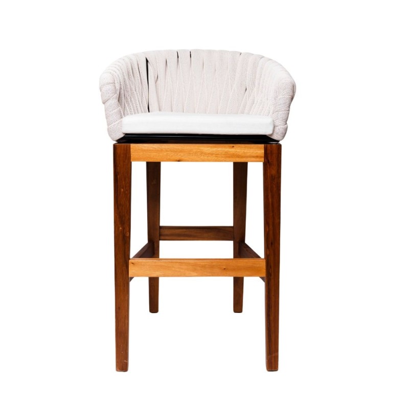 Banco moderno y elegante con estructura de madera en acabado natural y respaldo tejido textilene fomie. Incluye cojín en el asiento para mayor comodidad. Su diseño versátil lo hace ideal para barras, cocinas y terrazas, combinando funcionalidad y sofisticación en cualquier espacio. Disponible en distintos colores.