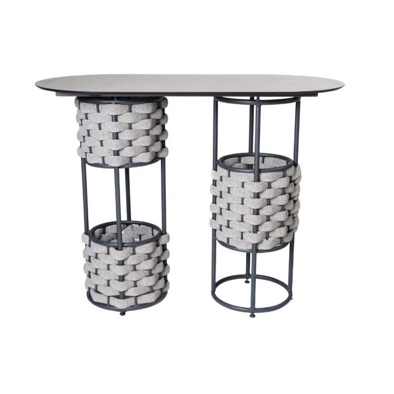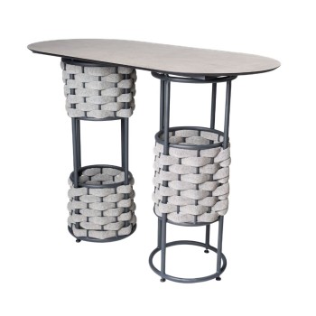 Mesa periquera con metálica que garantiza estabilidad, mientras que las bases cilíndricas tejidas con textilene fomie aportan textura, volumen y un toque contemporáneo. La cubierta alargada con esquinas redondeadas refuerza su carácter moderno, haciéndola perfecta para barras, terrazas o espacios sociales. Ideal para interiores o exteriores. Disponible en diferentes materiales y colores.