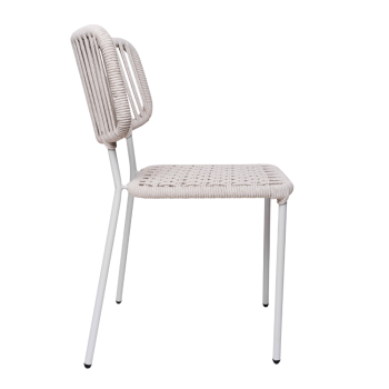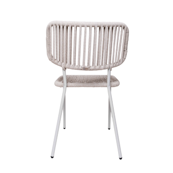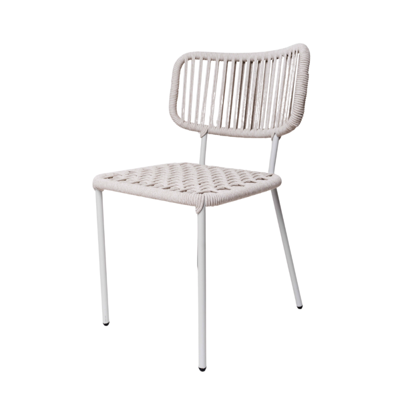 Silla versátil y artesanal. Su estructura metálica ligera se complementa con un tejido trenzado en cuerda sintética, que aporta textura, frescura y comodidad. Ideal para interiores y exteriores. Perfecta para comedores, terrazas o espacios de descanso, aportando un estilo natural y contemporáneo. Disponible en diferentes materiales y colores.