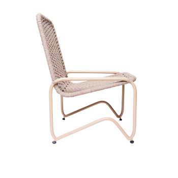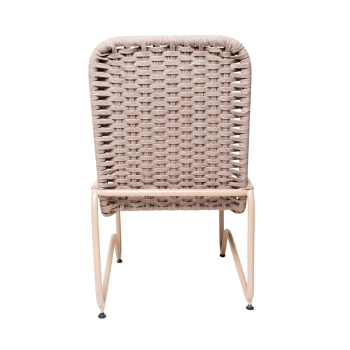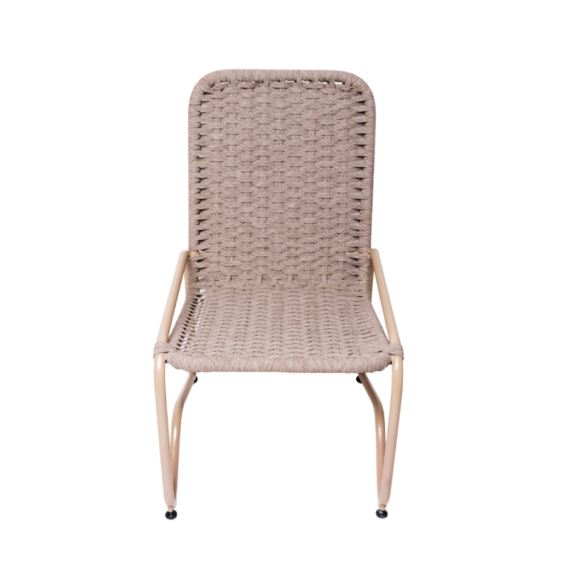 Silla con estructura metálica tubular, de líneas curvas y delgadas que aportan ligereza visual. El asiento y el respaldo están elaborados con un tejido trenzado sintético, que combina funcionalidad y estética artesanal. Ideal para espacios exteriores o interiores. Disponible en diferentes materiales y colores.