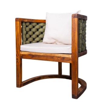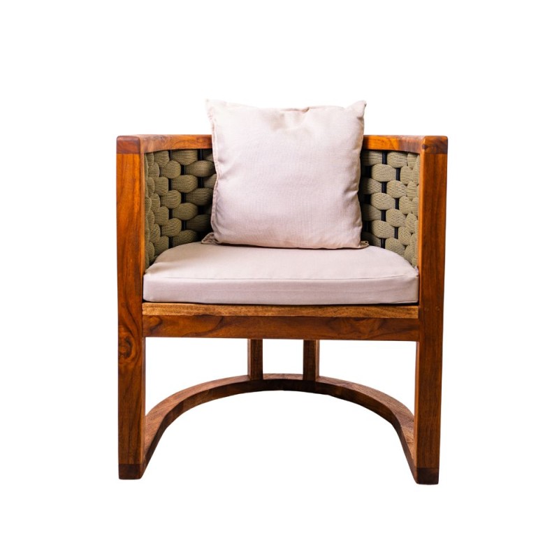 Silla que combina diseño contemporáneo y calidez natural en una pieza. Su estructura de madera sólida en acabado natural aporta robustez y carácter, mientras que el respaldo tejido en textilene fomie añade textura y un toque artesanal. Los cojines brindan suavidad y comodidad, convirtiéndolo en el complemento perfecto para interiores o terrazas techadas con estilo sofisticado. Disponible en diferentes colores.