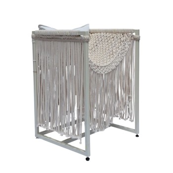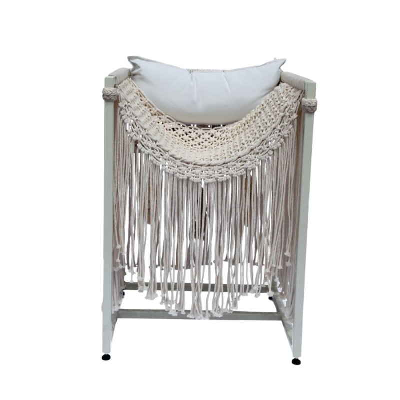 Silla es una pieza bohemia y elegante que combina artesanía y confort. Su estructura metálica brinda firmeza y durabilidad, mientras que el respaldo de macramé tejido a mano añade un toque artístico y natural con sus flecos decorativos. El cojín aporta suavidad y comodidad, convirtiéndola en una opción ideal para espacios interiores o terrazas. Disponible en diferentes colores.