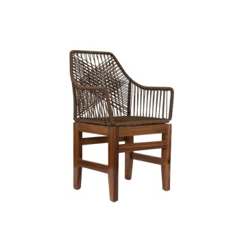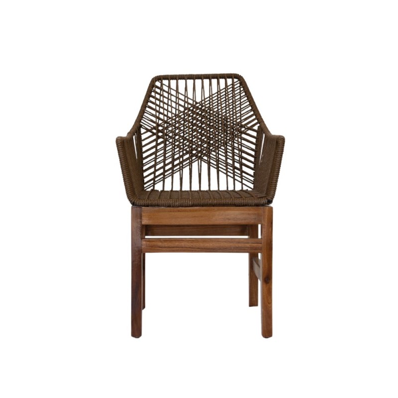 Silla de diseño contemporáneo con estructura de madera sólida en acabado natural. Su respaldo y reposabrazos están elaborados con un tejido artesanal, formando un patrón geométrico distintivo que aporta estilo y originalidad. Ideal para interiores o terrazas cubiertas. Disponible en variedad de materiales y colores.