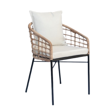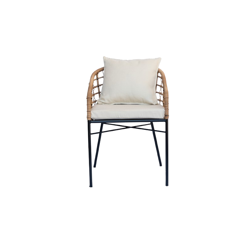 Silla compacta, versátil y cómoda. Estructura metálica y tejido en respaldo y descasabrazos. Incluye cojín de asiento y respaldo para mayor confort. Perfecta para comedores, terrazas o interiores con un toque contemporáneo. Disponible en diferentes materiales y colores.