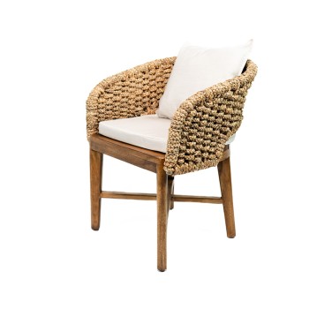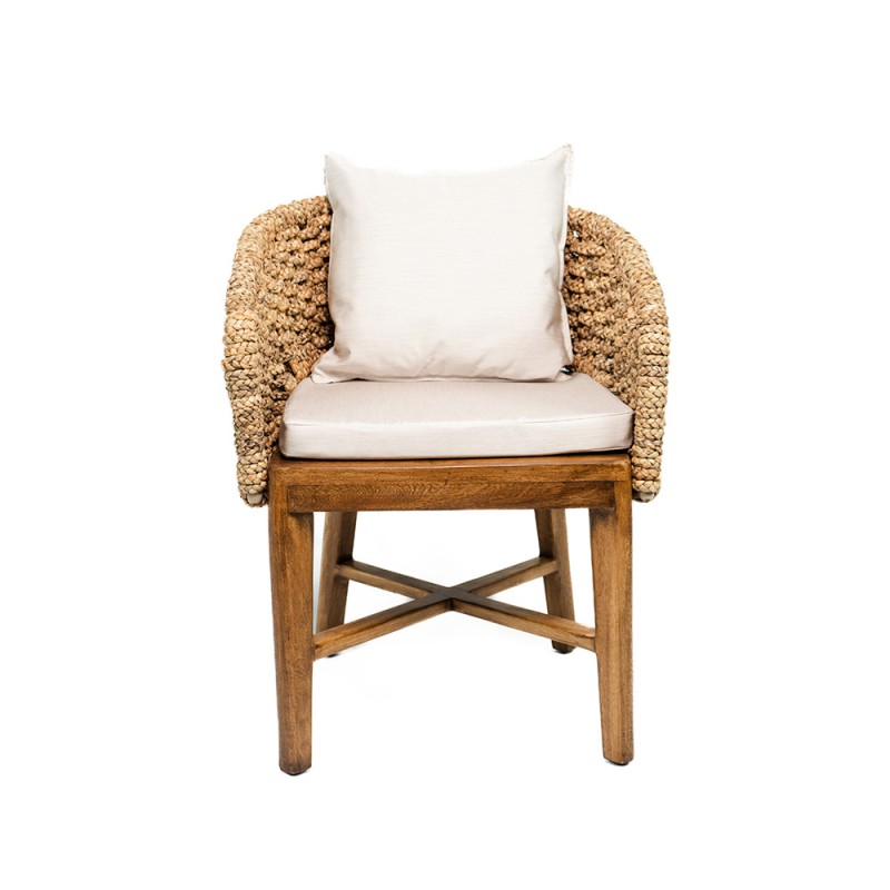 Silla de diseño artesanal y moderno, con estructura de madera y tejido en fibras naturales. Sus cojines en tono beige brindan comodidad y elegancia. Ideal para interiores o terrazas cubiertas. Disponible en diferentes colores.