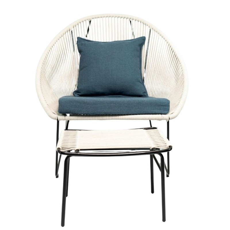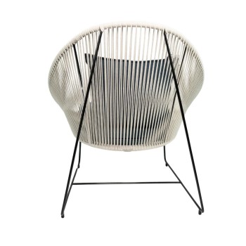 Silla amplia e innovadora con estructura metálica y respaldo tejido. Incorpora cojines que brindan comodidad y confort, acompañada de reposapiés a juego. Su diseño versátil la hace ideal para interiores y exteriores. Disponible en distintos materiales y colores.