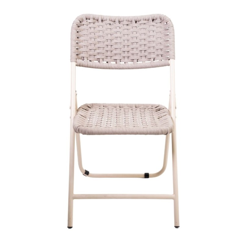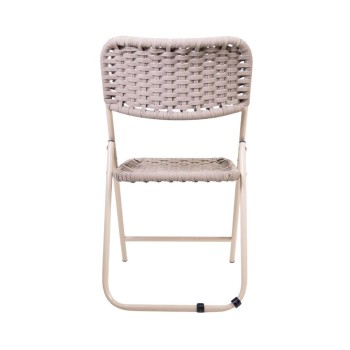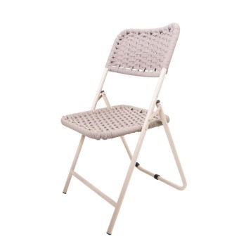 Silla plegable práctica y funcional, con estructura metálica ligera, el asiento y el respaldo están elaborados con tejido cerrado, lo que le aporta resistencia y un estilo artesanal moderno. Su diseño permite guardarla y transportarla fácilmente, siendo ideal para interiores o exteriores. Disponible en diferentes materiales y colores.