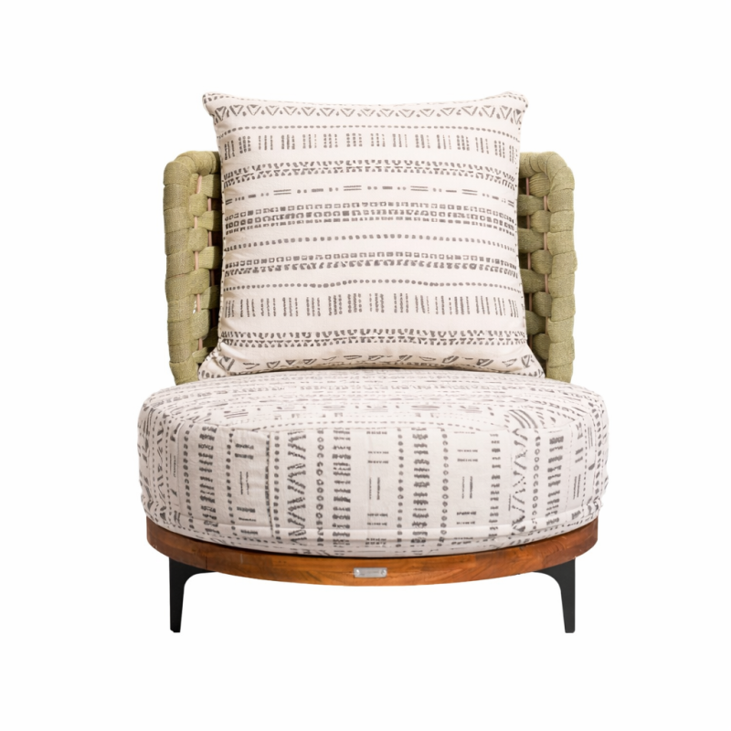 Sillón individual de diseño moderno con base circular en madera y estructura metálica, con respaldo tejido que aporta textura y un estilo contemporáneo. Incluye cojín de asiento amplio y respaldo en tono gris, ofreciendo comodidad y elegancia. Ideal para salas, terrazas o áreas de descanso. Disponible en diferentes materiales y colores.