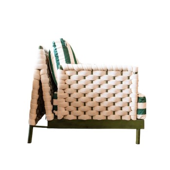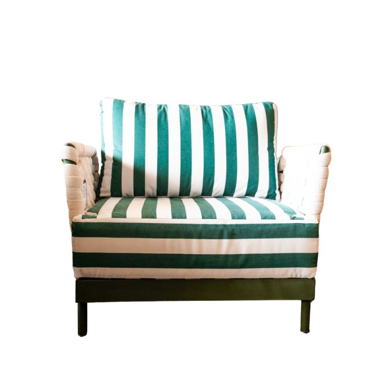 Sillón que destaca por su diseño vibrante y contemporáneo, perfecto para dar vida a cualquier espacio. Su estructura metálica combina con un tejido lateral trenzado en textilene fomie y cojines, creando un estilo fresco y elegante. Ideal para terrazas, jardines o salas con un toque moderno y sofisticado. Disponible en diferentes colores.